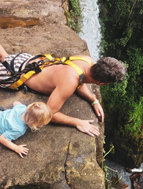 Auf der anderen Seite des Passes angekommen, bemerken wir schnell die Temperaturveränderung. Mocoa befindet sich in einer subtropischen Zone, die Luftfeuchtigkeit und die Hitze sind hier enorm. Dennoch haben wir hier eine kleine Aktivität ins Auge gefasst. Wir wollen zum "Fin del mundo" Wasserfall wandern, angeblich um die 2 Stunden oneway, wir packen also Diego in die Kraxe und ziehen vorsichtshalber unsere Wanderschuhe an, sicher ist sicher. Der Hinweg läuft stetig bergauf über rutschige, dauerhaft nasse und vermooste Steine. Unsere Schuhe bieten fast keinerlei Halt, Wasserschuhe aus Neopren wären hier angebracht gewesen. Wir haben Angst vor dem Rückweg bergab. Drei Flussquerungen später erreichen wir tatsächlich in der Zeit den schönen Wasserfall - den man eigentlich nur beim Blick über die Abbruchkannte zu Gesicht bekommt. Also alle an den Klettergurt und dann geht's mit dem Oberkörper in Richtung dem Ende der Welt. Diego gefällt es auf jeden Fall. Auf dem Rückweg bekommen wir noch den Hinweis, am Besten an den extrem rutschige Stellen unsere Wanderschuhe auszuziehen und in Socken zu laufen. Unsere anfängliche Skepsis weicht schnell, denn es funktioniert und wir rutschen nicht mehr so einfach weg - immer diese ungeschickten Gringos.